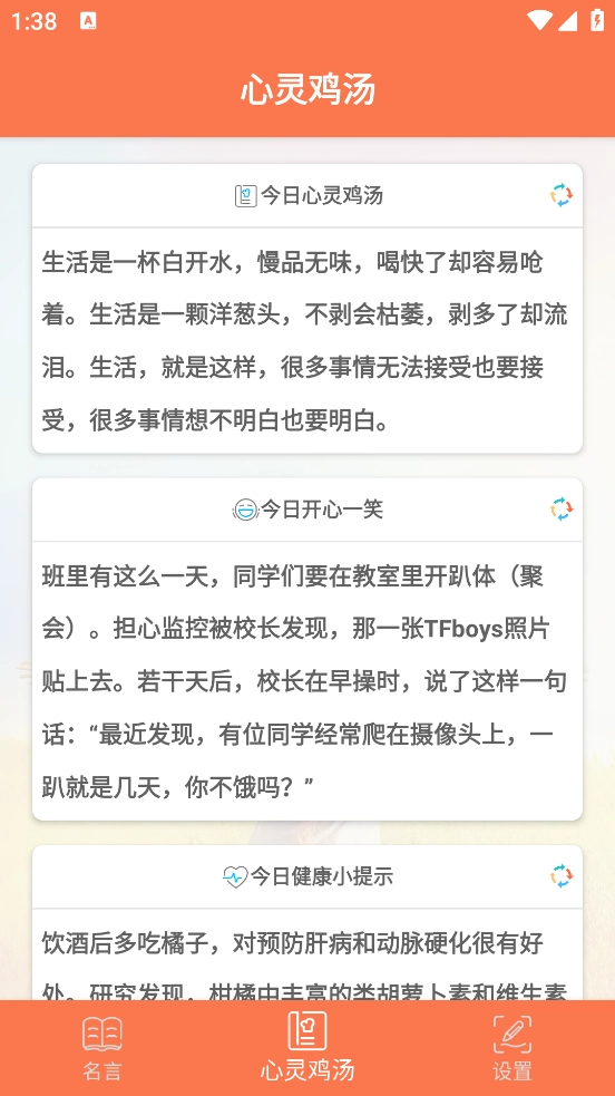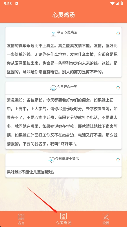 4、进入到心灵鸡汤,能看到软件推送的鸡汤和一个笑话