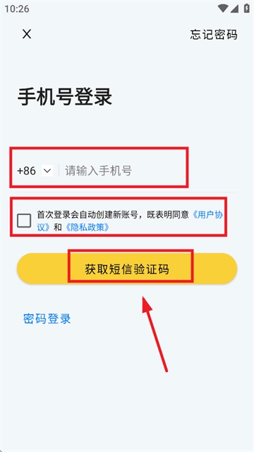 输入手机号码,勾选首次登录选项,系统将自动创建新账号。勾选此选项即表示您同意《用户协议》与《隐私政策》。随后点击“获取短信验证码”,获取验证码后,即可凭借该验证码完成注册登录操作。