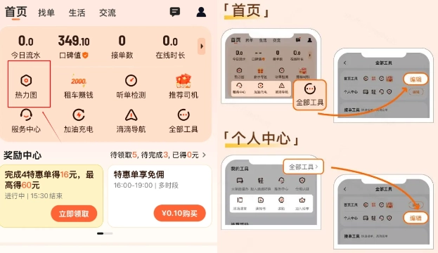来到首页,点击左上方的【热力图】,就能查看周边热区啦。顺着热区跑车,接到订单的几率会更大哟。