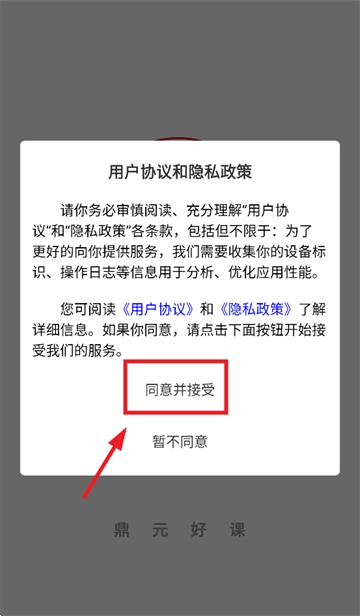 安装并打开鼎元好课,先同意并接受用户协议和隐私政策
