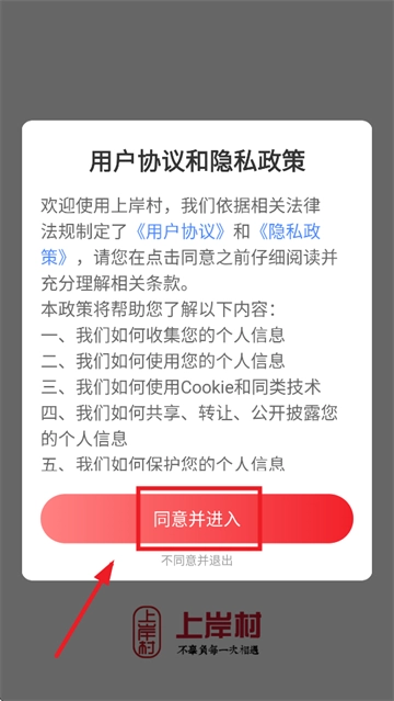 安装并打开上岸村,在用户协议和隐私政策提示界面点击同意并进入