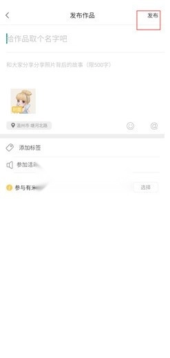 在【发布作品】页面,填写好标题、文案等信息后,即可点击右上角的【发布】按钮。
