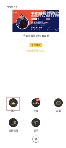 在此处能够发布图片、vlog、文章、视频课程以及进行提问等,就拿发布【图片】来说;