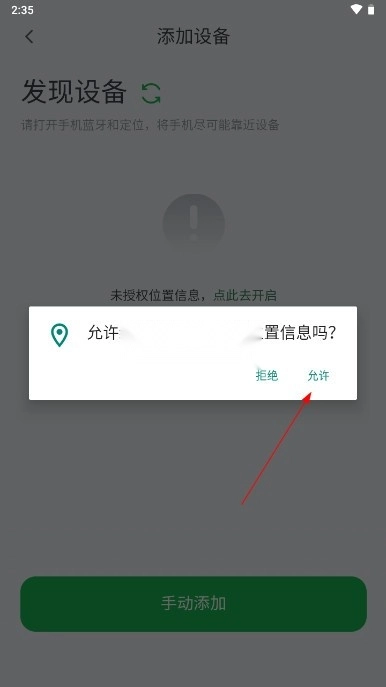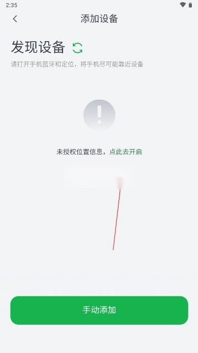 2. 您可以点击下方的“添加设备”按钮,或者点击右上角的“+”键,此时便会进入“发现设备”界面。在该界面中,点击屏幕中间的“点击去开启位置信息”权限,如此操作就能确保设备具备可搜索性。