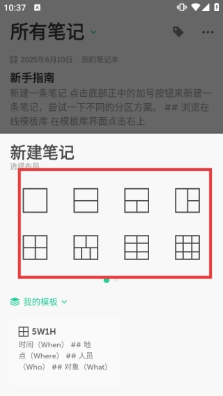 2、于“新建笔记”界面,选中红框里的分区方案,随即进入格子笔记编辑页面。
