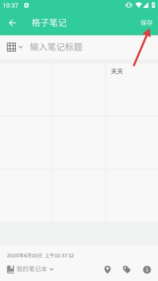 3、在格子笔记的编辑页面,输入标题后,点击右上角的【保存】按钮,即可完成笔记的创建。