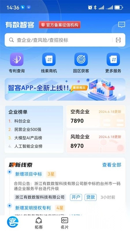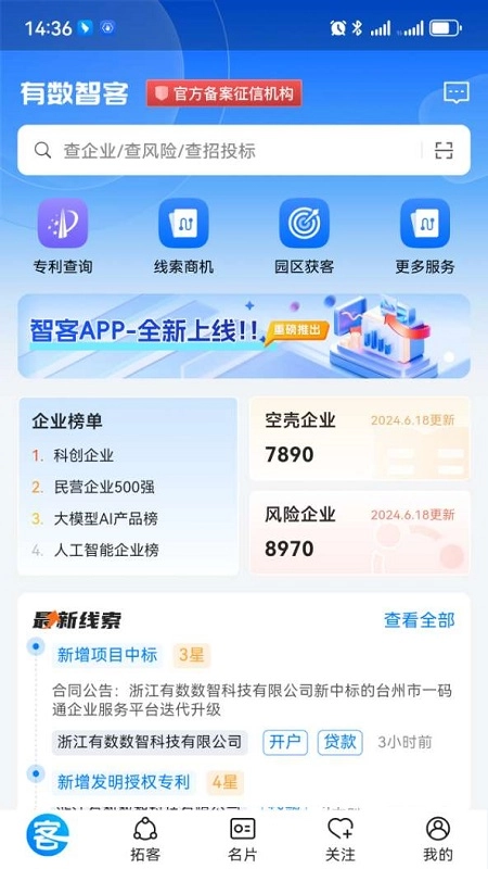 1. 首页顶端设有搜索框,用于搜索企业,查询企业风险与招标投标信息。其下方可进行专利查询、园区获客等操作。页面底部新增线索板块,助力用户更有效地获客。