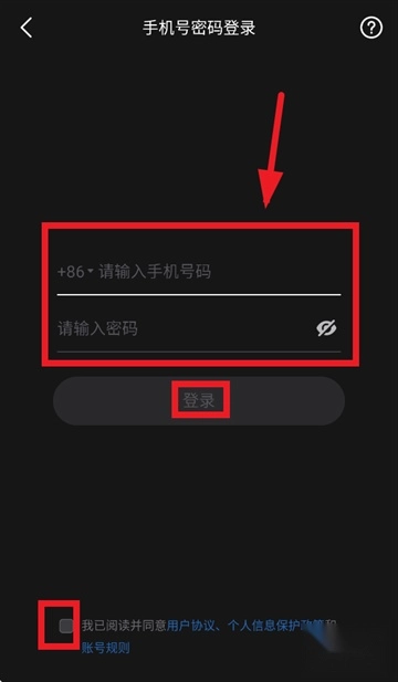 3、请依照要求填写手机号码与密码信息,勾选同意相关协议条款,随后点击“登录”按钮以完成操作。
