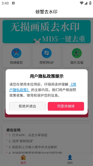 1、接着安装螃蟹去水印大师,打开该软件后要同意用户协议以及隐私政策。