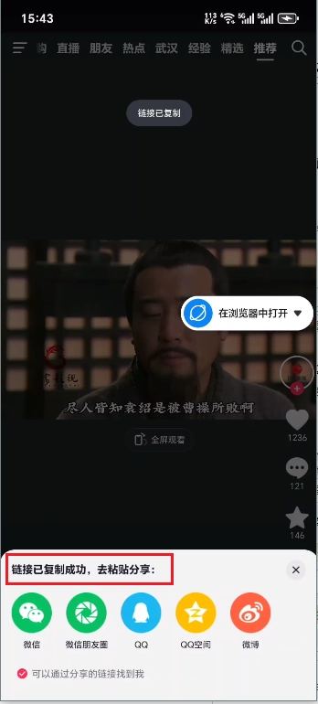 3、以抖音为例,在需要提取的视频或图片页面,点击分享按钮,选择复制链接。然后回到操作界面,在输入框中粘贴该链接,最后点击【提取】。
