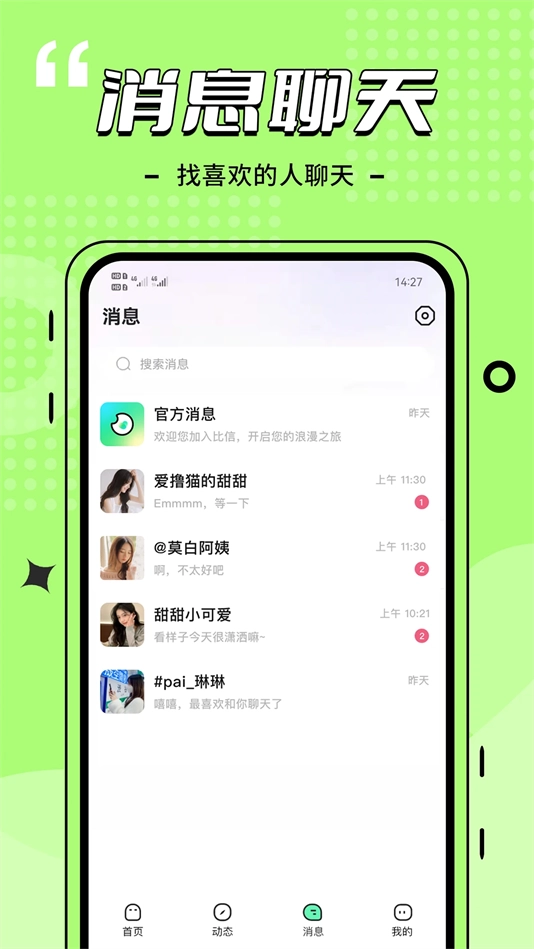 比信约玩正版,一款专为年轻人量身打造的聊天交友软件。软件内汇聚众多高质量用户,在这里,你能轻松结识任何感兴趣的朋友,畅快交友聊天,拓展自己的社交版图。不仅如此,还能借助精准匹配功能,寻觅人生另一半。有需求的小伙伴,赶快前来体验吧!