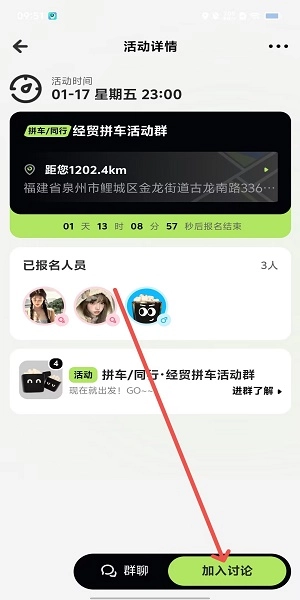 第三步,确认活动地址在社交范围之内,点击右下角就能参与讨论。