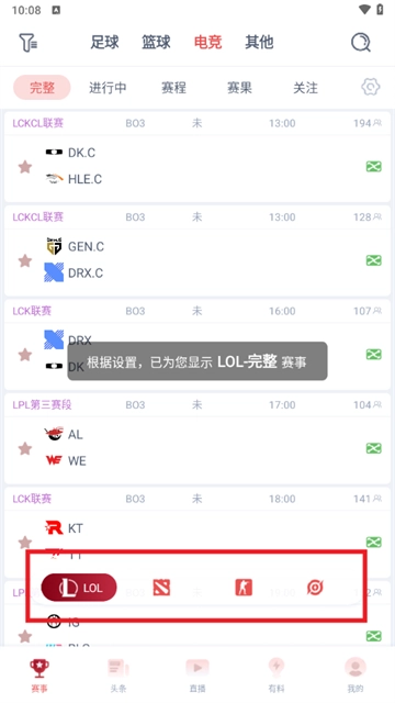 2、接着能看到当前的LOL赛事,并且还能够点击框框内的选项来切换赛事。