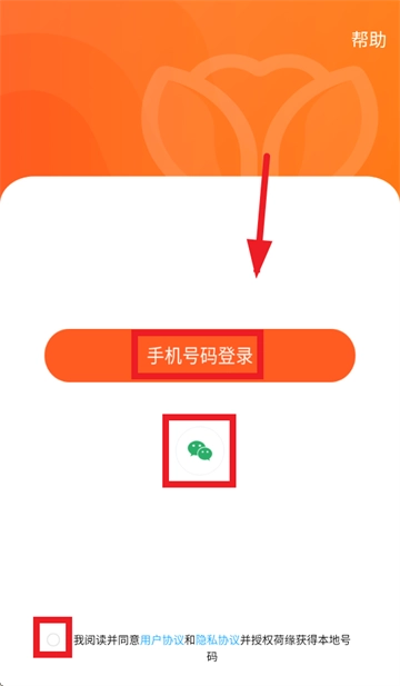 当您进入登录界面,需勾选“我阅读并同意用户协议和隐私协议”,同时授权荷缘获取本地号码,随后您既可以选择通过手机号码登录,也能选择微信授权登录。