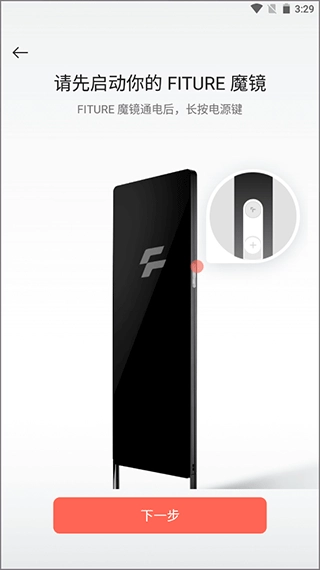 3、然后让魔镜处于通电状态并长按电源键,点击下一步;