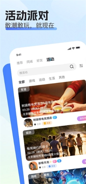 组局与活动功能:其核心在于助力用户自主发起各类兴趣组局活动,或是加入已有的相关活动,这些活动广泛涉及游戏、运动、生活等诸多领域。同时,该功能还设有活动详情展示板块以及报名入口,使用户能够便捷参与同城活动,或是参与那些自己感兴趣的活动,从而达成从线上组局到线下相聚的社交完整闭环。