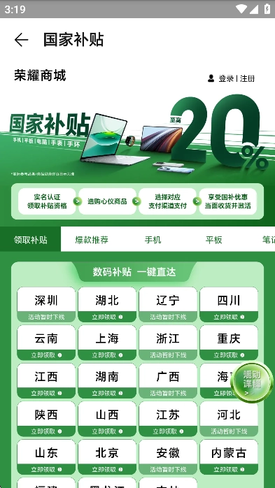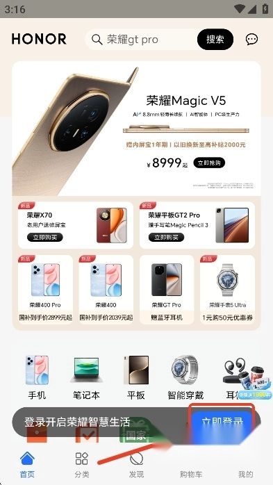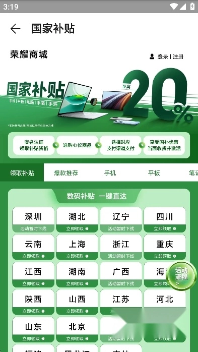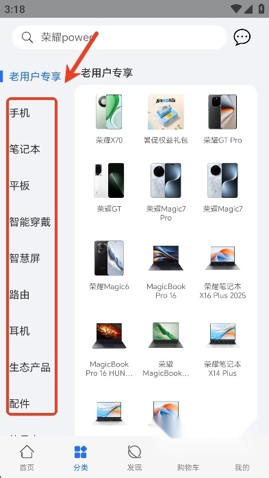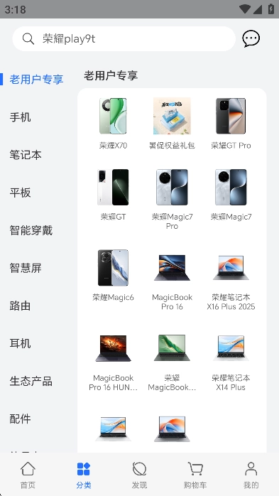 登录后,用户们可以在商城里面挑选自己需要的荣耀产品,包括手机,笔记本,平板等电子产品