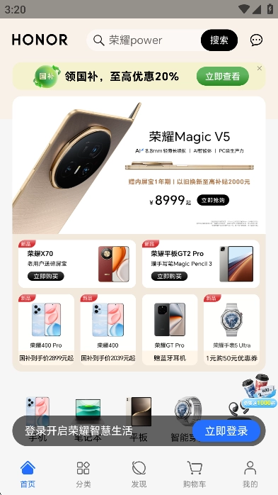 全品类商品资源丰富,囊括荣耀旗下众多类型产品,像手机、笔记本、平板、智能穿戴设备、智慧屏以及耳机等等,全方位覆盖各类智能产品使用场景。同时,还会展示商品的详细信息,诸如价格、配置、优惠活动以及赠品等,助力用户全面知悉产品情况。