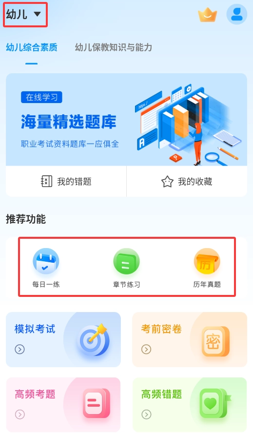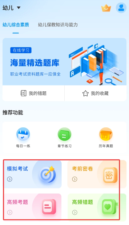 2. 就幼儿教师资格而言,题库主要包含“综合素质”与“保教知识”两大板块,同时提供每日练习、分章节训练以及历年真题这三种学习模式。