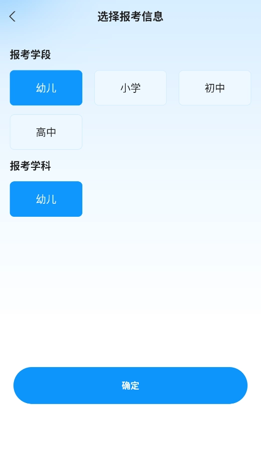 1. 开启教资刷题通App,第一步要选择报考学段(如幼儿、小学、初中、高中等),之后系统将依据所选内容自动匹配相应题库。