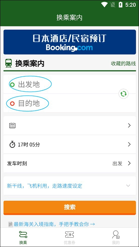 1、首先我们进入换乘案内,在主页我们可以选择自己的出发地、目的地和出发时间,选择好后点击搜索。