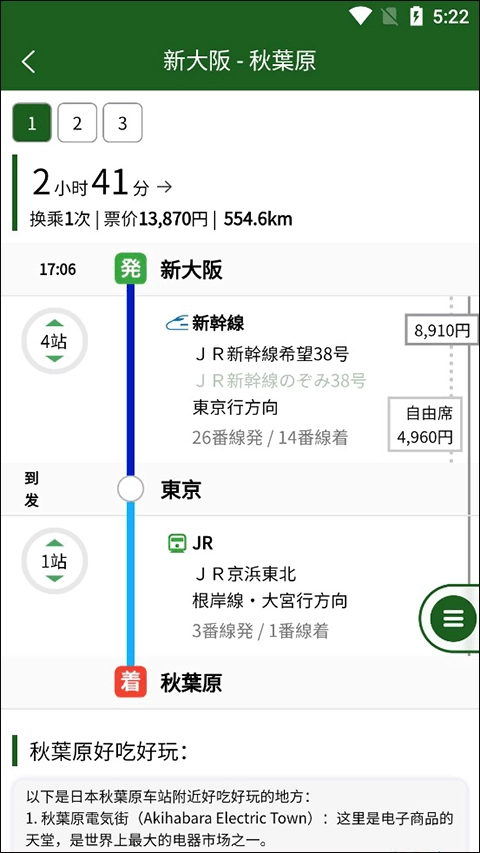 2、在此,小编以从新大阪前往秋叶原为例,能看到系统推送了3个方案,并且把这3个方案所需花费的时间以及购买的票价都标识出来了。