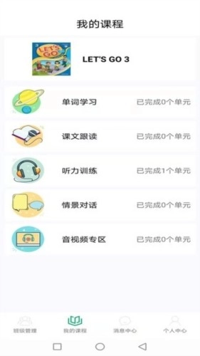 3、内部设有“单词学习”“听力训练”“课文跟读”“情景对话”“音视频专区”等学习模块。