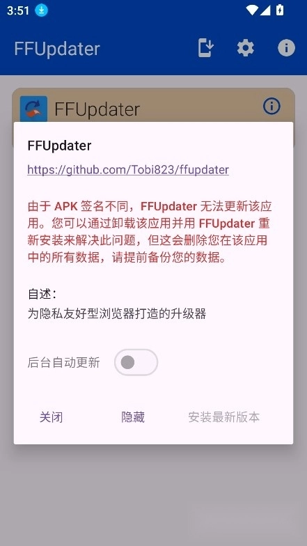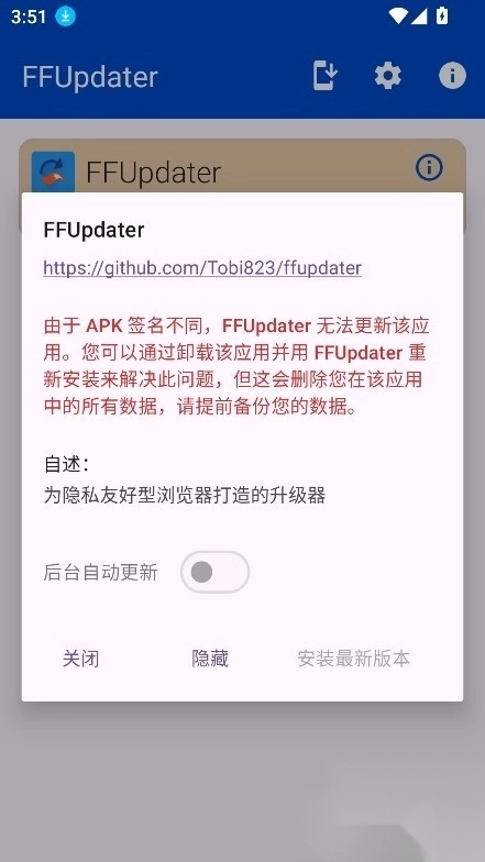 FFUpdater在GitHub上的最新版本,是一款专门为Mozilla Firefox浏览器设计的升级助手。此应用支持Firefox的稳定版、Beta版以及Nightly版升级,可满足不同用户的需求。FFUpdater能够自动检测Firefox的最新版本,当有可用更新时,便会提醒用户进行升级。在找到新版本后,FFUpdater会自动获取对应的安装包,并在后台进行静默安装,无需用户手动操作,而且还会保留用户的书签、扩展等设置。
