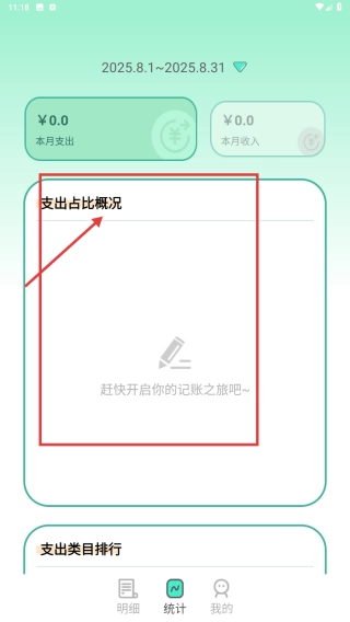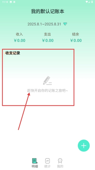 1、在明细界面点击收支记录区域,开始添加收支账目,开启记账之旅,点击查看记录。