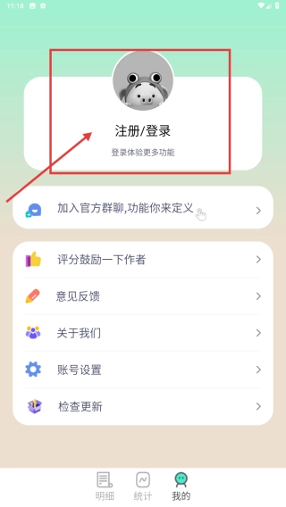 3、进入我的界面,点击注册/登录,完成账号操作,体验更多个性化记账功能,点击登录。