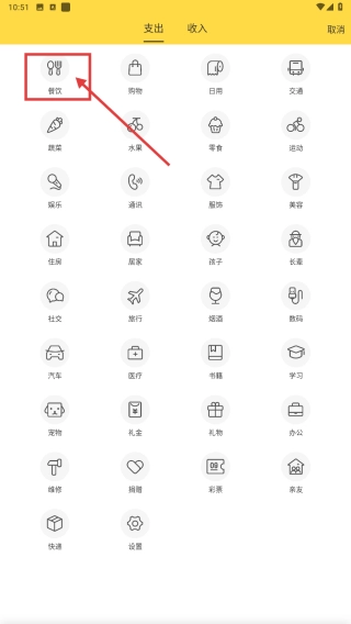 2、在支出分类中,选择餐饮类别,明确消费类型为餐饮支出。