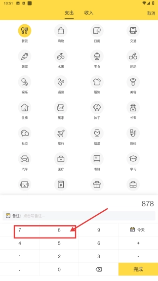3、输入消费金额878,点击完成,记录餐饮消费,管理日常收支。