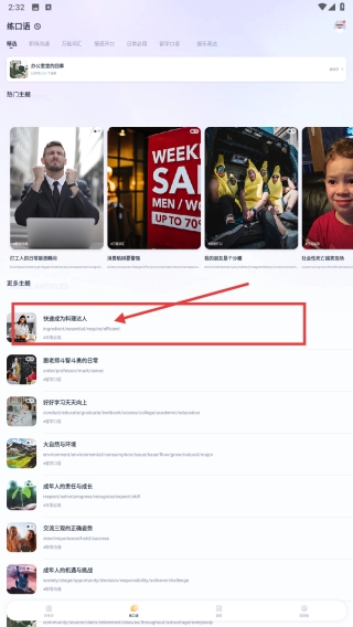 2、进入炼口语页面,选择快速成为英语达人内容,开启口语学习流程。
