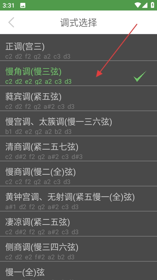 2、在调式选择页,挑选目标调式,如慢角调。