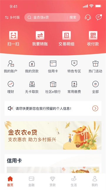1. 首页不仅具备切换至乡村版的功能,还拥有交易明细、转账等基础功能。同时,它支持扫码、收付款操作,并且可以查看信用卡账单还款情况。