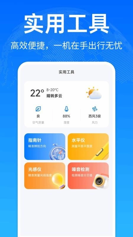 这里为你准备了诸多实用工具,像指南针、水平仪、光感仪以及噪音检测工具等,你都能在此使用。