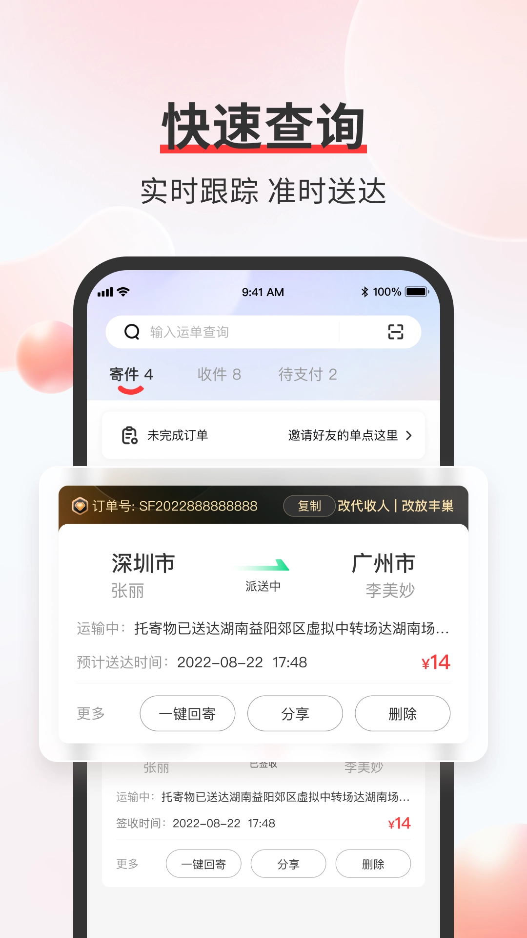 顺丰速运推出的这款一站式快递物流服务软件,新用户首次登录即可立刻领取寄件红包,它还提供查快递、寄快递、网点查询、运费查询等相关服务。