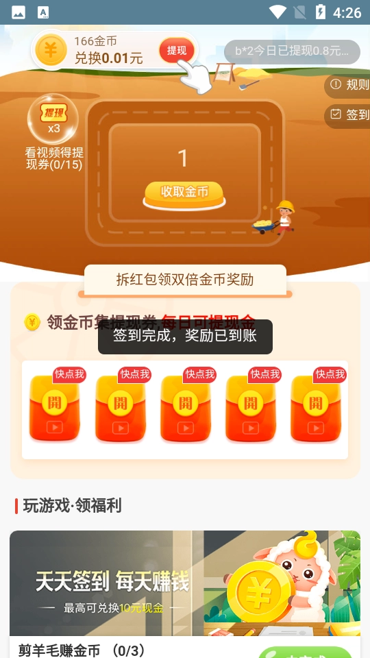 2. 完成每日签到任务,赚取红包奖励。