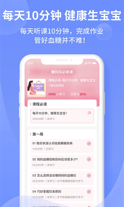 重磅课程来袭:国内首套专为糖妈妈量身打造的标准课程,由国内顶尖的内分泌与妇产科专家携手精心编制。每天仅需抽出10分钟听课,并完成课后作业,就能助力您迎来健康可爱的宝宝。