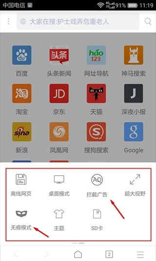 6、在菜单中向左滑动,便能看到更多实用功能。其中,拦截广告和无痕模式相当好用。不少人都好奇浏览器怎样去除广告,只需点开拦截广告功能即可。