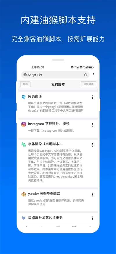 无需安装额外的第三方脚本管理器,浏览器本身就内建支持油猴脚本(如GreaseMonkey、Tampermonkey ),并且能够兼容绝大多数油猴脚本,这使得浏览器的功能得到了极大提升。