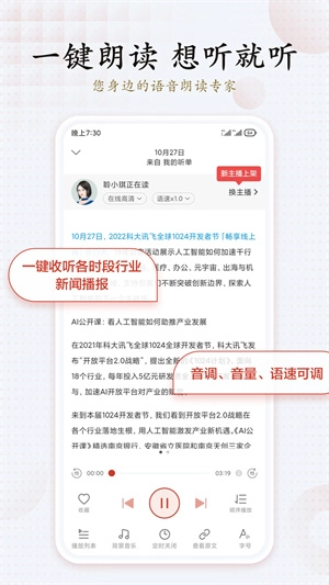 讯飞有声,一款极为实用的听书应用,借助先进的人工智能技术,能一键把用户选定的文章、网页、图书等转化为语音,并一键开启朗读。它不受时间限制,随时都能使用,操作十分便捷。
