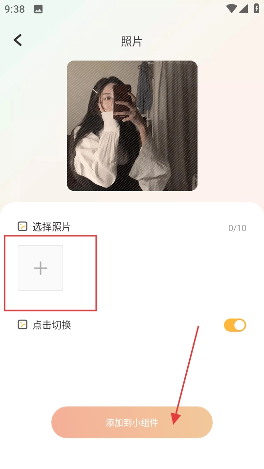 3、进入照片设置页面后,点击+号选择照片,再点击添加到小组件。