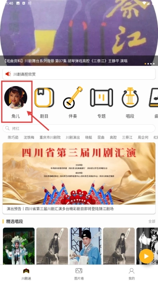 1、打开川剧应用,点击角儿选项,进入角儿风采展示页面。
