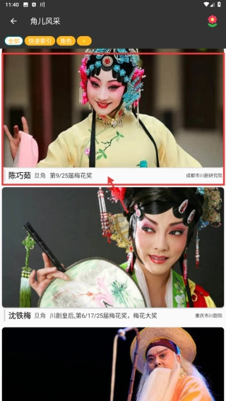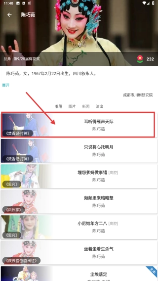 2、在角儿风采页面,找到陈巧茹相关内容条目,点击进入其个人详情页。