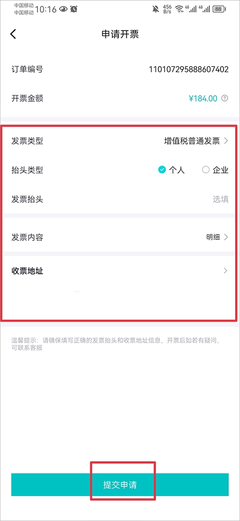 4、最后选择发票抬头、类型、以及地址后,点击提交申请即可