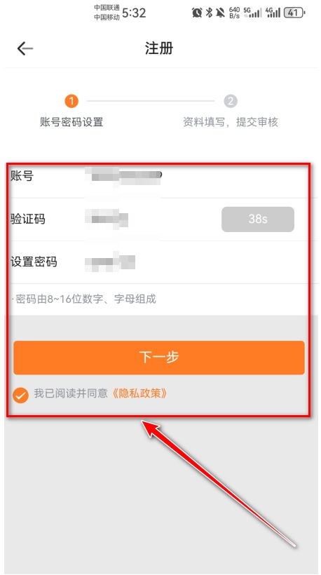 2.先输入自己的手机号码、验证码,然后设置密码,勾选我已阅读并同意《隐私政策》,最后点击下一步。