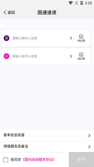 3、寄件页面,添加寄件人信息,添加收件人信息,基本信息完善,勾选我同意就可以寄件了。