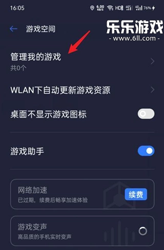 5、完成添加操作后,进入游戏空间界面,找到并点击“桌面不显示游戏图标”的开关。