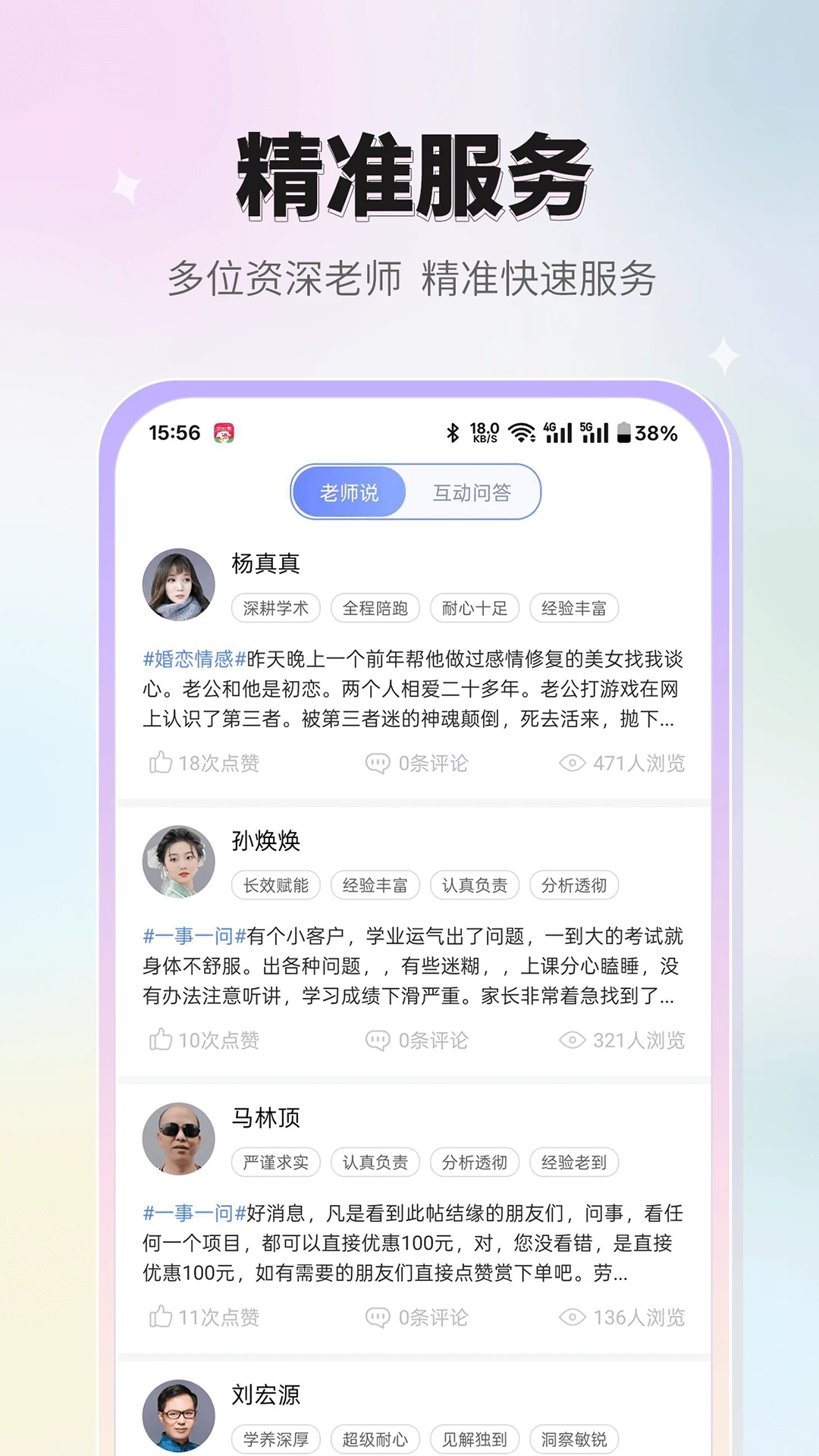 平台会不定时开展免费的大师答疑活动,在此期间,用户能够在线免费提出问题,并得到专业的解惑建议。